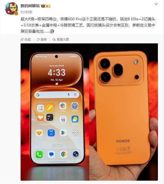 日前,数码博主“数码闲聊站”再次晒出了疑似荣耀600 Pro的正反面真机照,并配文称,“超大R角+极窄四等边,荣耀600 Pro这个正面还是不错的,骁龙8 Elite+2亿镜头+3.5X长焦+金属中框+冷雕玻璃工艺,国行版镜头设计会有区别,参数定义是中屏巨容量电池……”据业内人士表示,如果该机国行版将在镜头设计上做出差异化调整,那么应该会摆脱海外版网友“果味太浓”的吐槽,更有望打造专属辨识度。