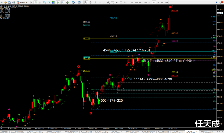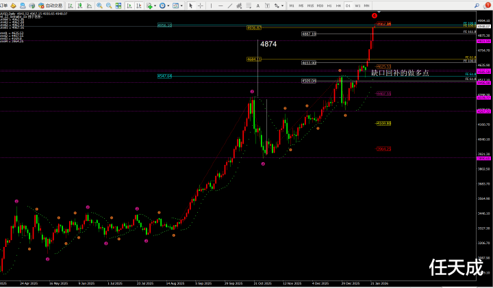 综合而言:因为日线目前蜡烛图偏离均线,所以日内有一定的回落空间,但是目前多头走势保持不变。短期4小时也在高位震荡还未出现回落迹象,所以空单需要耐心等待。虽然小时线出现了回落信号,但是因为4小时和日线所以回落空间比较小。也就是早间的回落空间应该在4916-17左右,极限4880-90附近。然后价格二次上涨等待4小时出现回落的信号,并且这波4小时的回落也基本可以带动日线级别的回落。那么日线级别短期的上升接近尾声,下周就开始需要高位布局空单看4650-4540-4400附近。