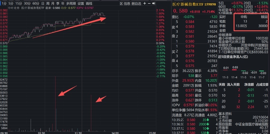 11月10日午后,沪指拉升翻红搭搭网,食品饮料、美容护理、医药行业等板块强势。数据显示,医疗器械指数ETF(159898)目前涨1.75%,盘中获得净申购约1100万份,按实时净值计算约640万元。